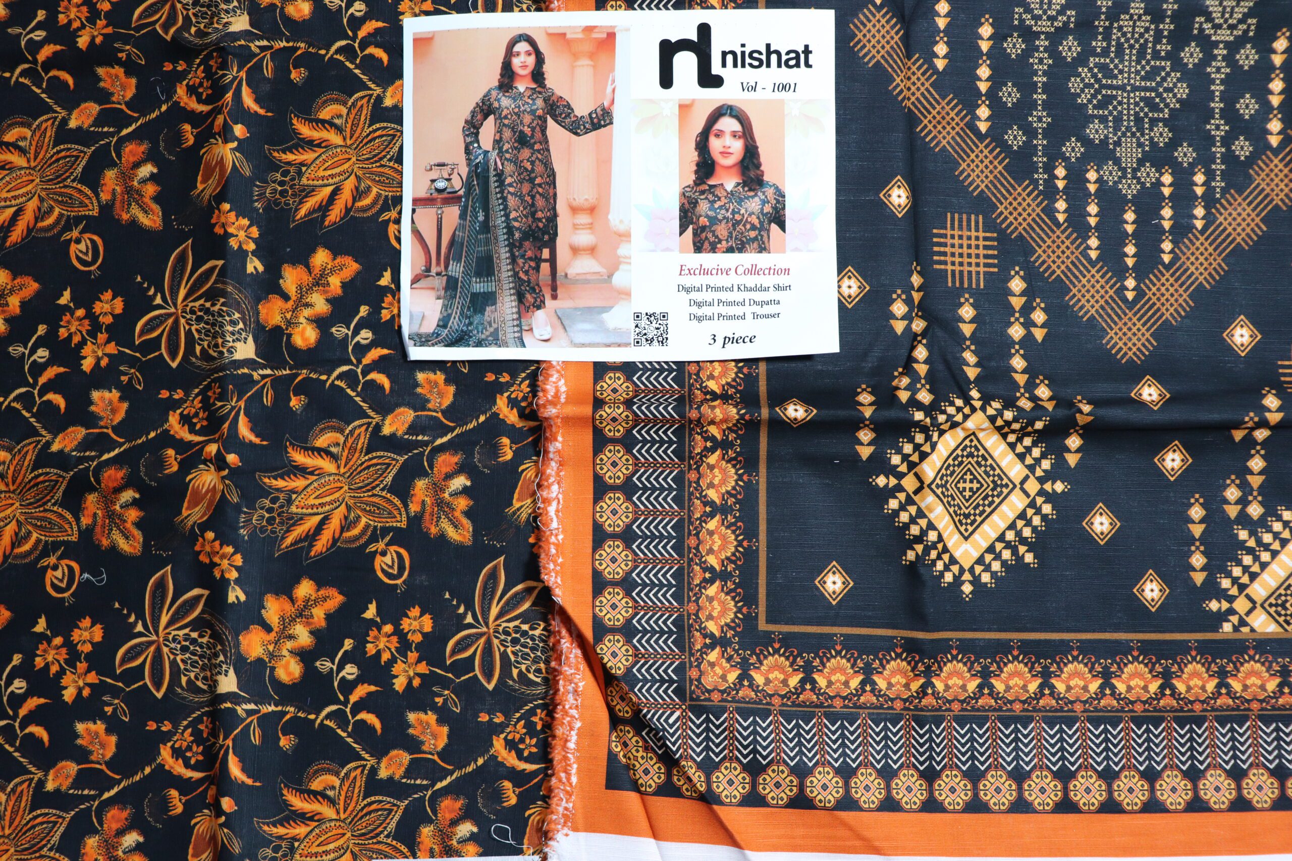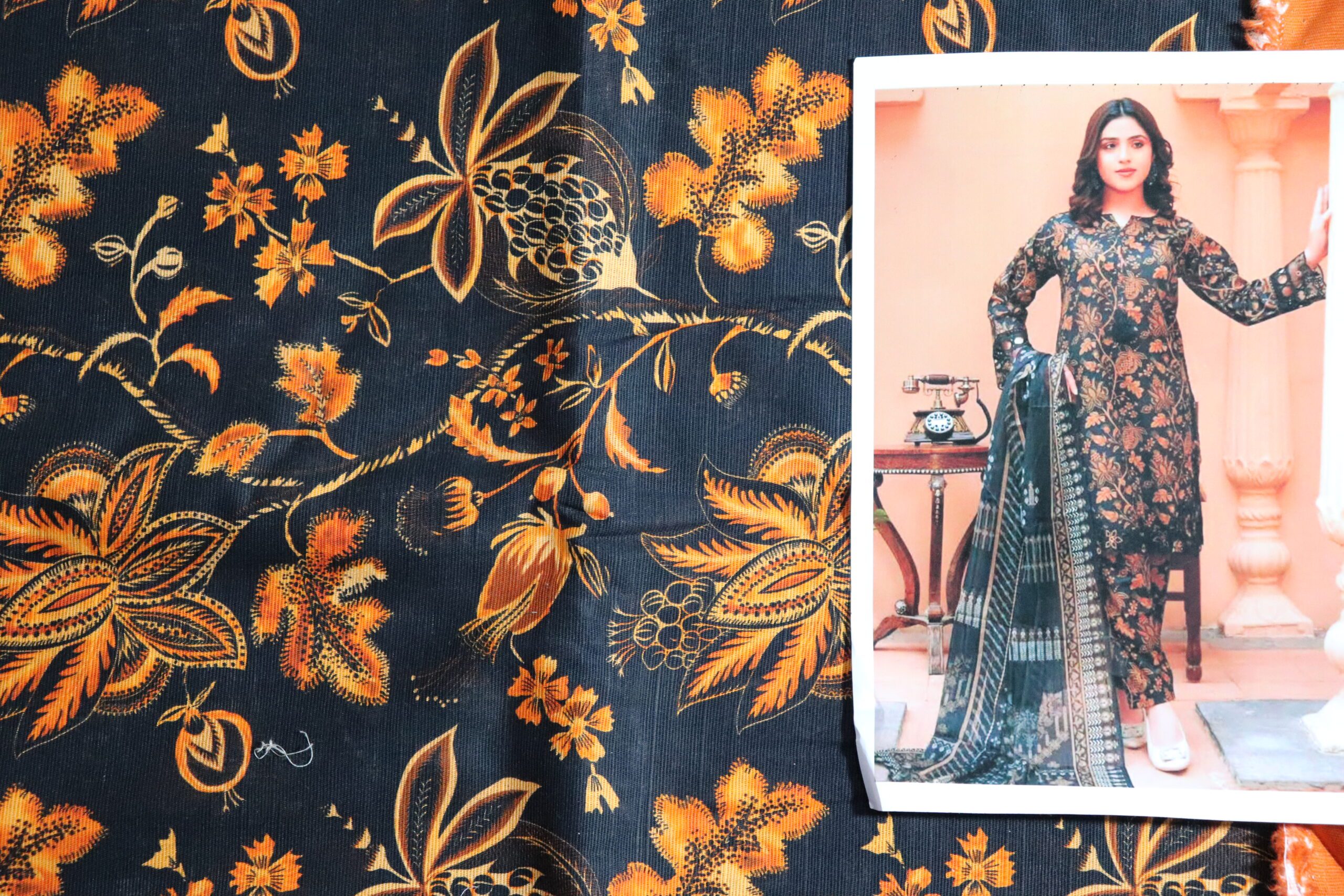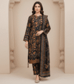 A striking 3-piece khaddar suit featuring a bold black and orange color combination with an elegant all-over print. Made from premium khaddar fabric, it ensures warmth, durability, and refined style — perfect for winter gatherings and everyday wear.